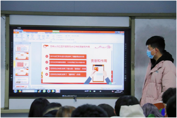 在宣讲会上,孙会强同学围绕“从党史中再识长征”主题,从红军长征的基本概念、怎样认识遵义会议与其前后一些会议的关系、怎样认识红四方面军在长征中贡献和作用、中央红军到达陕北后的两个“奠基礼”四个方面展开宣讲,孙会强指出,红军长征,是中国共产党和红军谱写的壮丽史诗,是中华民族伟大复兴历史进程中的巍峨丰碑。我们要不断弘扬伟大的“长征精神”,向一代代优秀共产党员学习,树立为中国人民谋幸福、为中华民族谋复兴的初心,走好新时代的长征路!