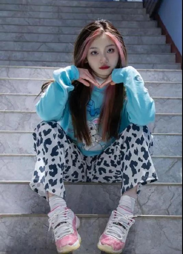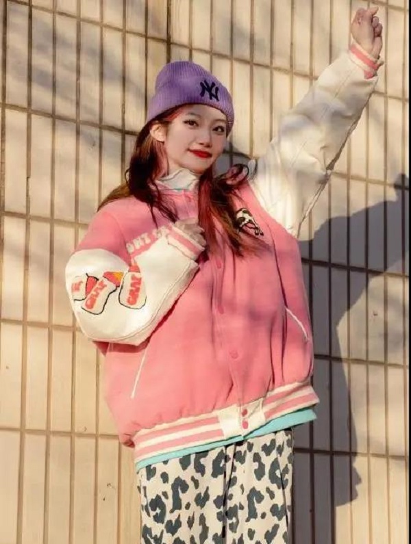 粉色外套俏皮可爱,紫色针织帽的撞色搭配更显少女灵气,奶牛花纹的裤子俏皮又充满活力,冬日依旧要元气满满呀。