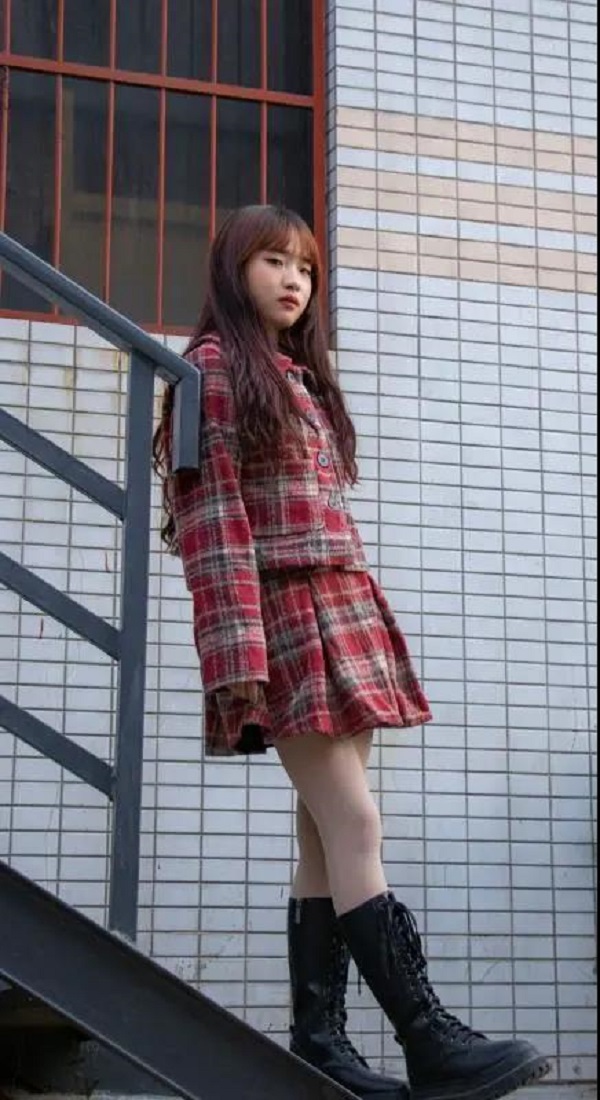 酒红色的制服套装与长靴的结合独特又吸睛,甜酷感与少女感完美相融。学院风满满,冬日里尽显绚丽。