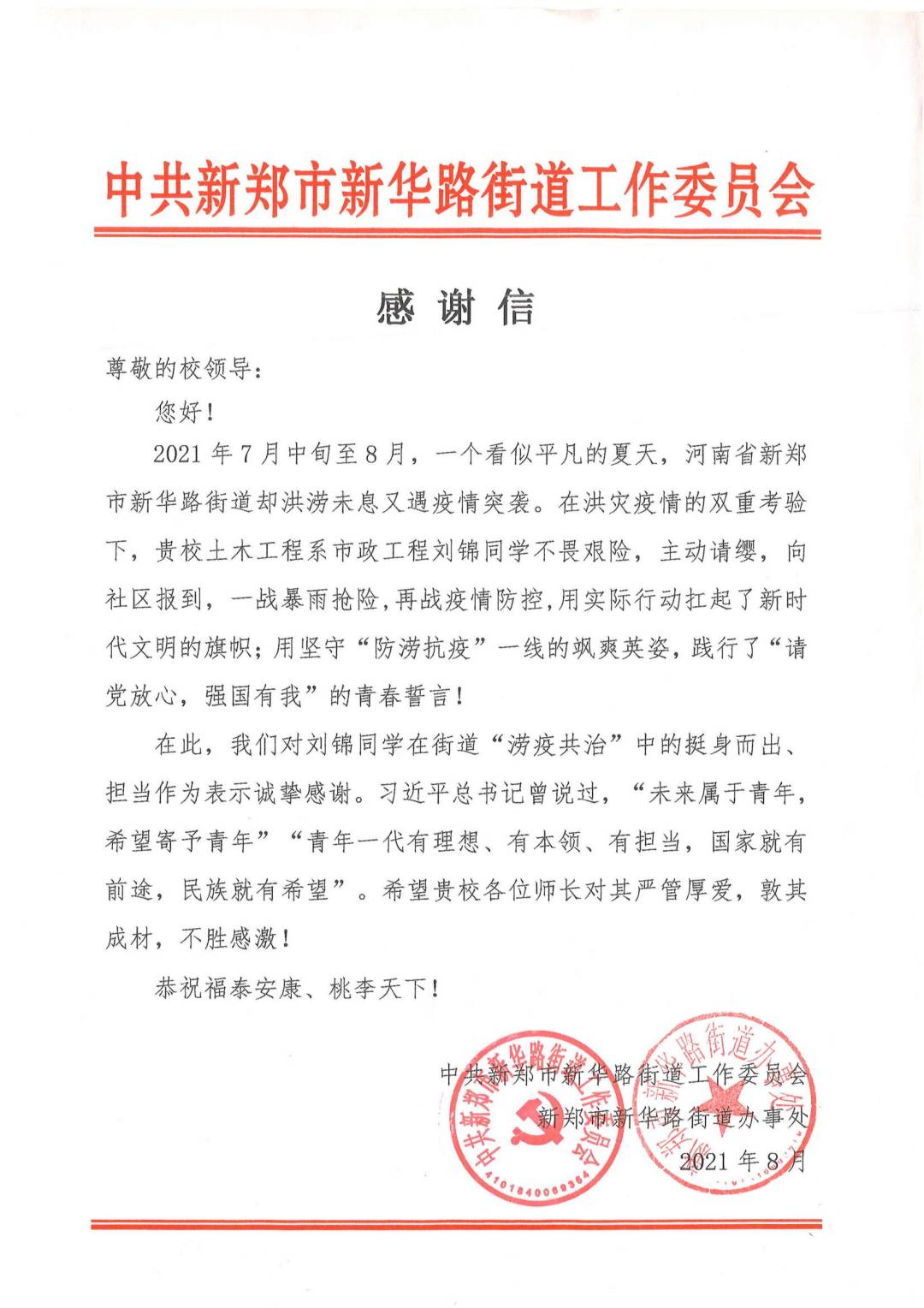 近日,中共新郑市新华路街道工作委员会向我校发来感谢信。感谢我校建筑工程系2021级市政工程技术专业刘锦同学在2021年暑假期间做出的积极贡献,给予高度评价和诚挚的感谢。