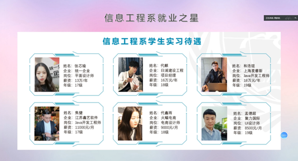 学生处周家祯老师就2017年至2020年信息工程系就业数据进行了介绍,对信息工程系98%平均就业率、毕业生95%总体满意度进行数据展示。重点介绍“达内特色班”就业之星的状况,现场连线分享了4位就业之星的经历。