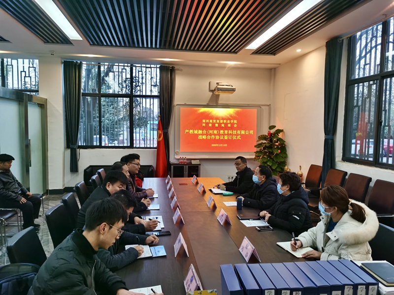 12月15日下午,我院与河南豫宛商会产教城融合战略合作框架项目签约仪式在院本部会议室完成。河南豫宛商会党支部书记梁小冰、常务副会长、诚一能源董事长程志杰、商会产教城融合委员会主任程敬沈、产教城融合(河南)教育科技有限公司董事常小平、石勇、袁俊辉、马增民等出席了仪式。我院党委书记郭林山、副院长巴玉强、王素湘、职业技能配培训中心冯静老师参加了签约仪式,签约仪式由党委书记郭林山主持。