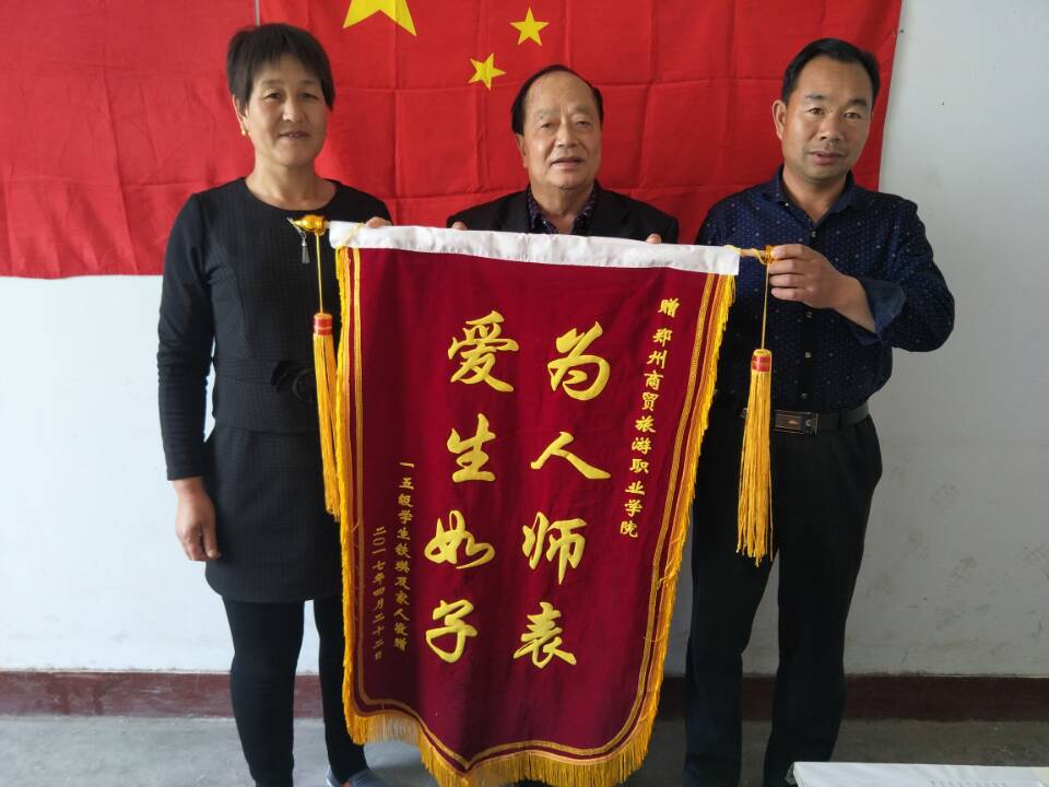 4月22日中午,艳阳高照。已经办好出院手续买好回家车票的铁瑛同学和父母,给学校送来了刚做好的锦旗。上面写着:“为人师表,爱生如子。”八个大字。