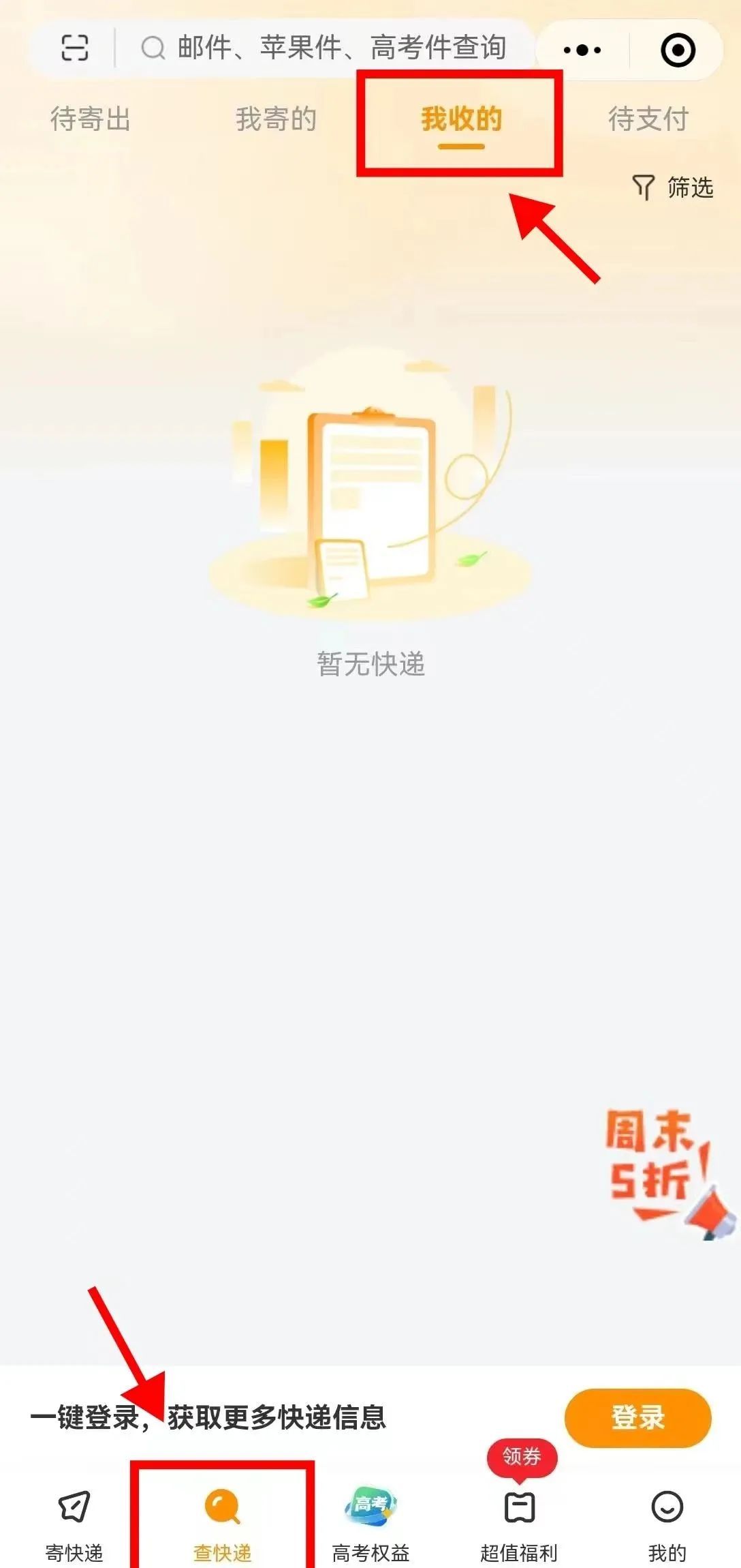 登录成功后,进入小程序首页面,点击下方导航栏中的“查快递”,再点击上方“我收的”,即可查看录取通知书邮寄情况。