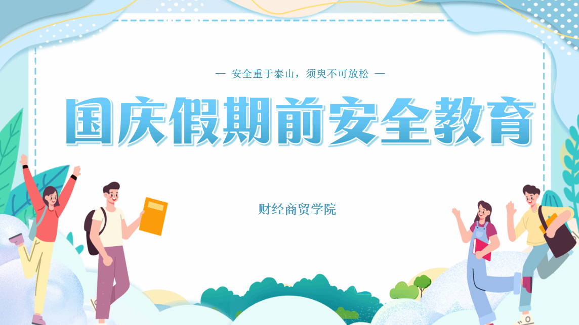 国庆节假期即将来临,为进一步做好财经商贸学院的安全保障工作,切实增强师生的安全防范意识,确保师生度过一个安全、愉快、稳定的假期。9月30日,财经商贸学院开展国庆节前安全教育工作,要求财经商贸学院教师在课堂中对学生进行节前安全教育。
