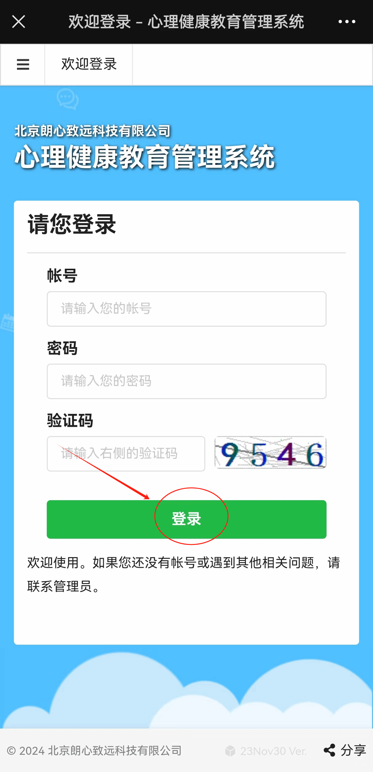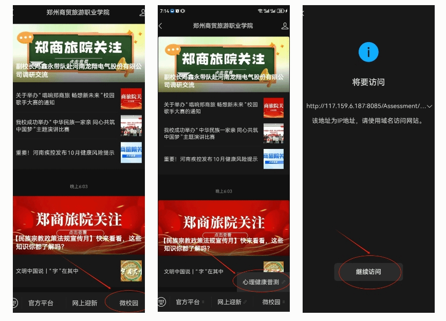 2.进入公众号,点击最下端“微校园”——“心理健康普测”——“继续访问”。