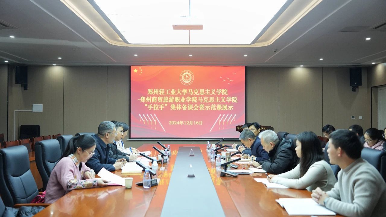 为深入学习贯彻党的二十届三中全会精神,切实提升思政课教学的针对性和吸引力,根据《教育部办公厅关于开展2024-2025学年高校思政课课堂教学提升行动的通知》要求,12月16日,我校马克思主义学院与郑州轻工业大学马克思主义学院在新密校区联合开展“手拉手”集体备课会暨示范课展示活动。郑州轻工业大学马克思主义学院党总支书记、教授、硕士生导师马寒,教学副院长、教授、硕士生导师易善武,实践教研室主任、教授、硕士生导师马铮,新思想教研室教师、副教授、硕士生导师李燕,我校校长郭国侠教授、副校长兼马克思主义学院院长冯鑫永教授、副校长康勇教授、思政课教师及各二级学院教师代表参会。会议由副校长冯鑫永主持。