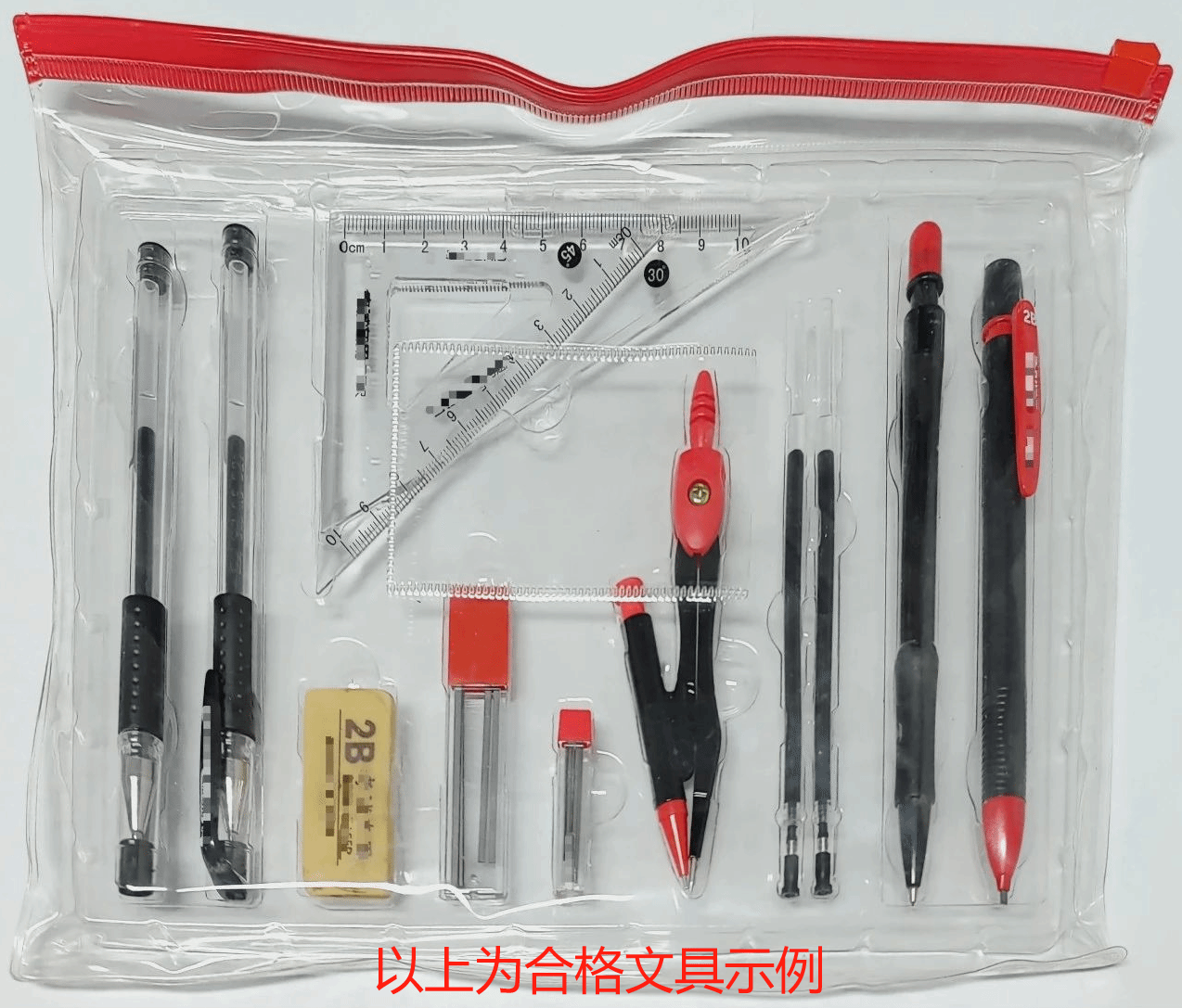 允许携带的文具为:塑料透明外壳黑色字迹中性笔(含备用芯)、塑料外壳自动涂卡铅笔(2B,含备用芯,可用楔形笔头)、绘图可换芯铅笔(HB或2B,含备用芯)、橡皮(无封套)、三角板(含45°、30°直角三角板)、圆规,以及用于文具收纳的全透明塑料文具袋(盒)。
