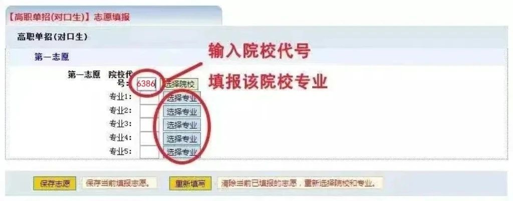进入志愿填报界面。输入学校代码6386,系统自动显示学校的名称。然后输入专业代号,系统自动显示专业,确认无误后保存。