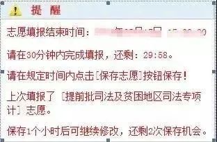 志愿填报计时,进去志愿填报页面后,填报区域右侧有一个倒计时提醒,志愿填报必须在30分钟内完成。如果考生30分钟后还没有保存志愿信息,系统会提示考生是否保存志愿信息。倒计时提醒如下图所示: