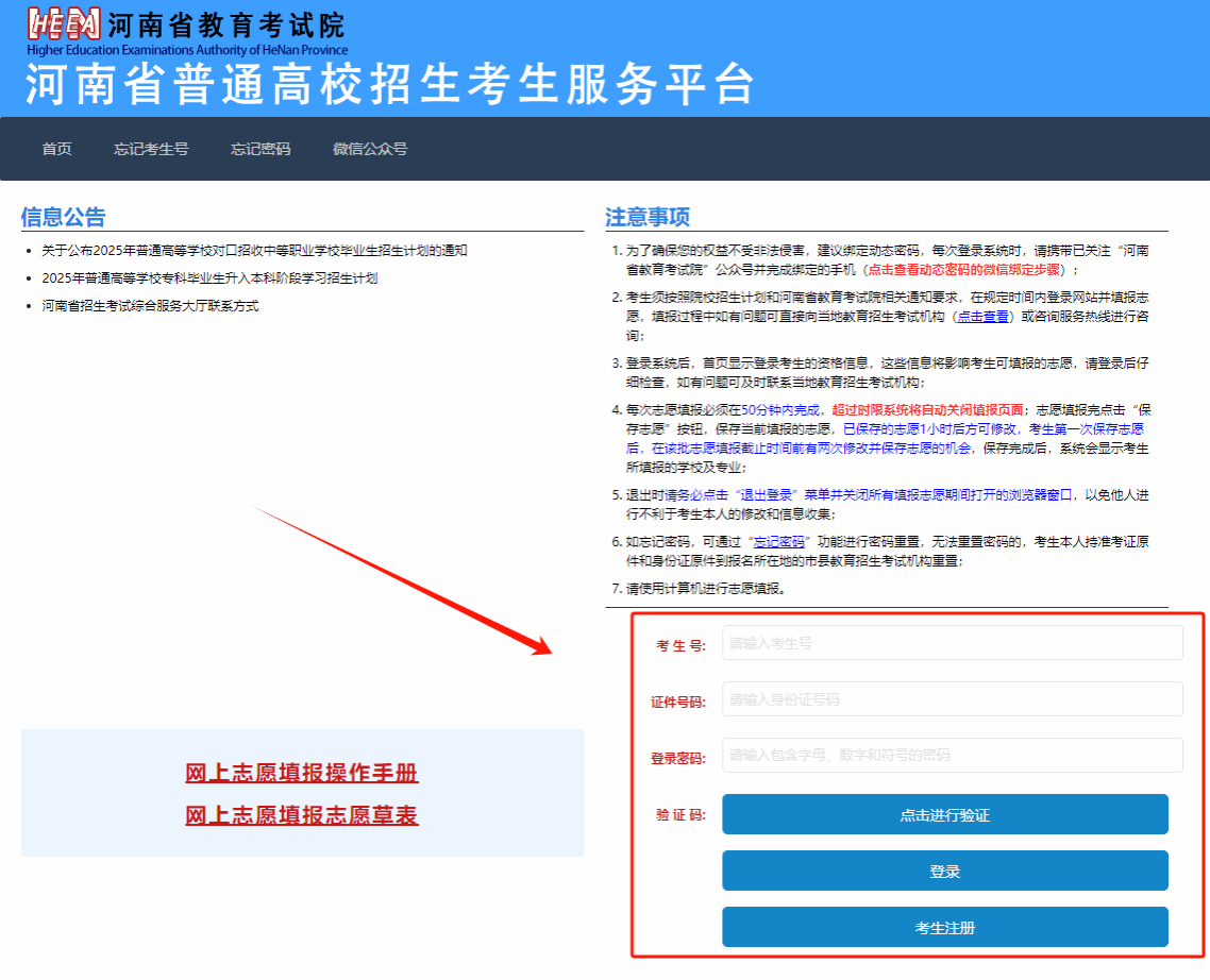 进入考生服务平台后,请仔细阅读“信息公告”区、“注意事项”区发布的政策公告和注意事项。