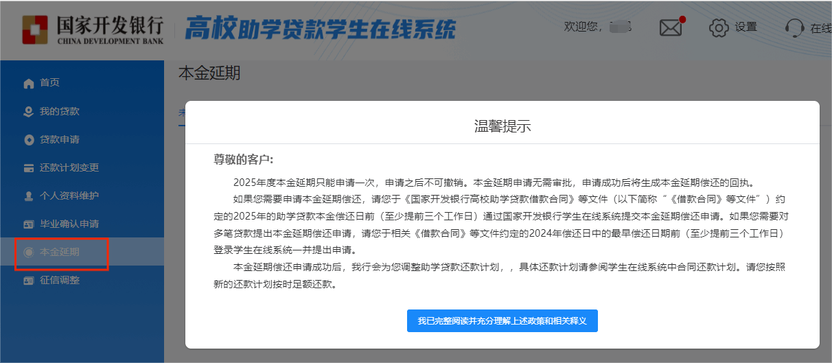 1.登录高校助学贷款学生在线服务系统https://sls.cdb.com.cn,点击菜单列“本金延期”,弹框政策提示弹框,点击提示框下方按钮“我已完整阅读并充分理解上述政策和相关释义”进入下一步(图①);