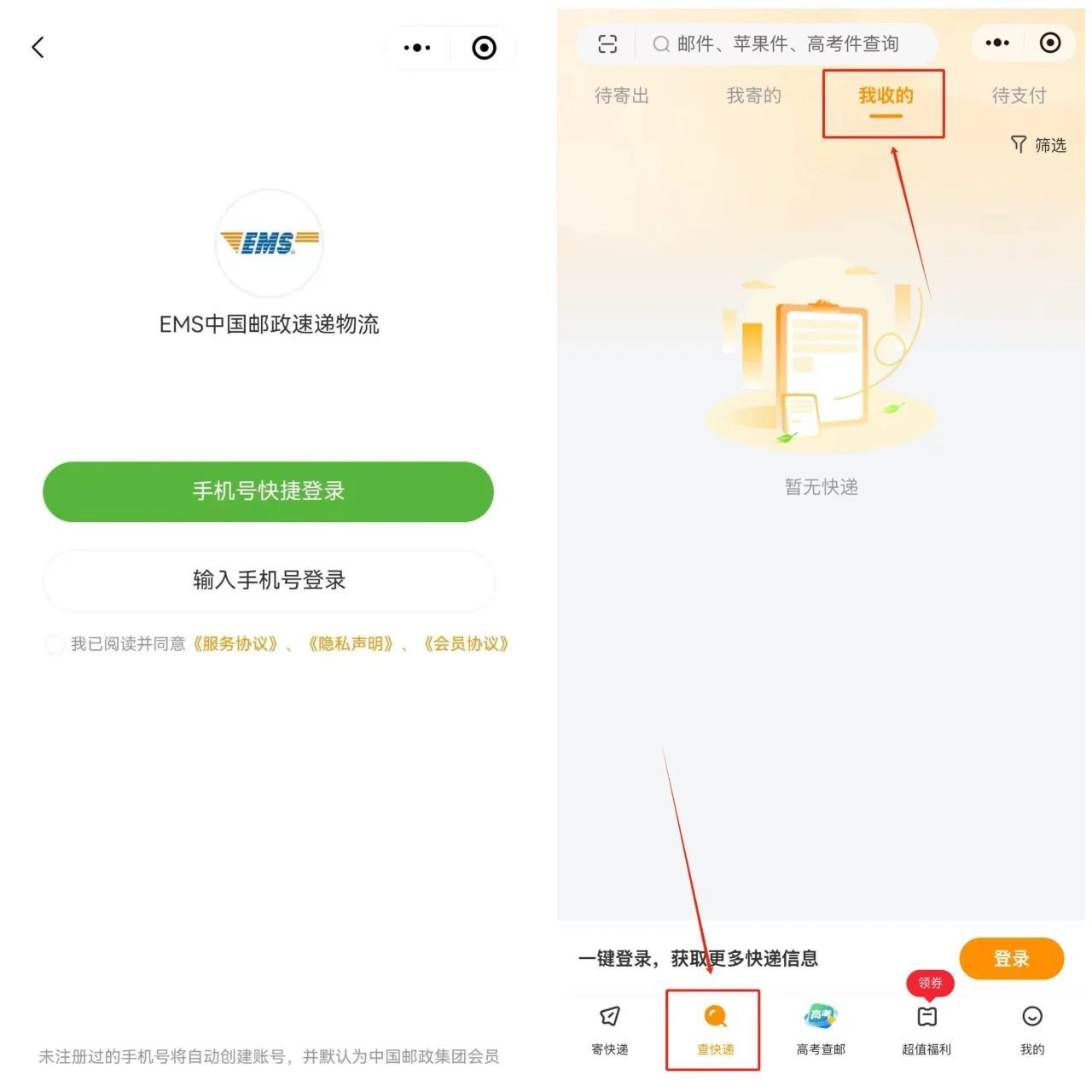 请使用邮寄信息中的手机号进行登录,登录成功后,进入小程序首页面,点击下方导航栏中的“查快递”,再点击上方“我收的”,即可查看录取通知书邮寄情况。