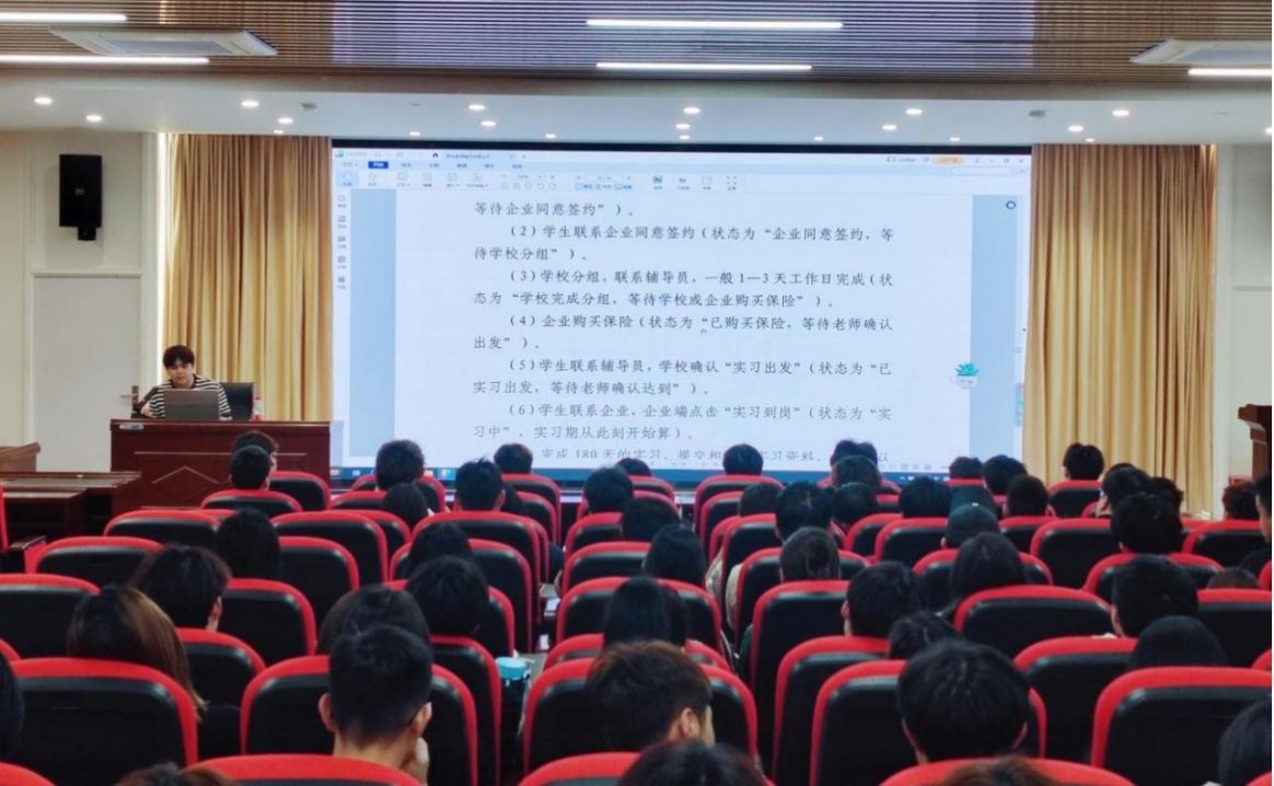 实训实习科副科长孙野全面细致讲解实习政策、备案流程、考核办法等,他强调了纪律要求、安全注意事项和实习材料提交时间节点,深入解读了岗位实习备案工作规定,并提醒同学们遵守学校及实习单位规章制度;同时对学生实习期间的安全常识进行了详细宣传。