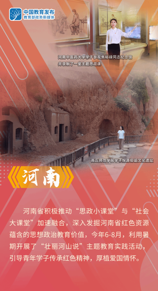 河南近年来,河南省将思政小课堂、社会大课堂和网络云课堂相连接,将读万卷书与行万里路相结合,善用“大思政课”,创新育人格局,提升育人效果,做到年年有主题,假期有活动,开学有引领,月月有备课,周周有精品。