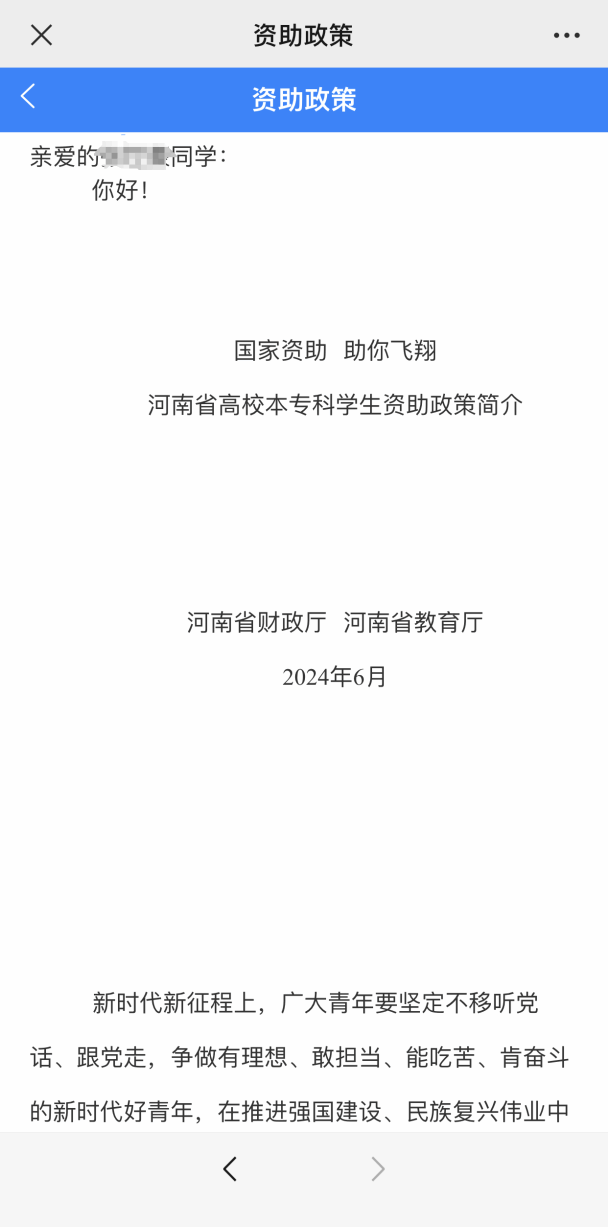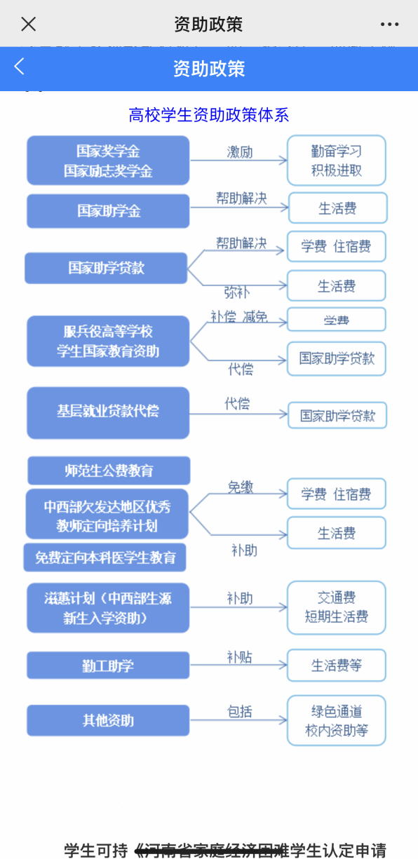 6.资助政策:学生仔细阅读资助政策的信息,需要全部阅读完毕之后,在最后一行下方点击“已阅读”按钮。