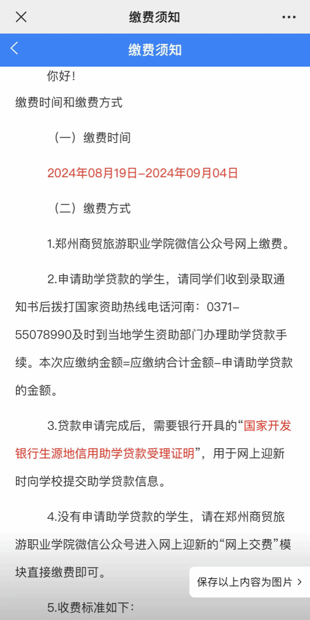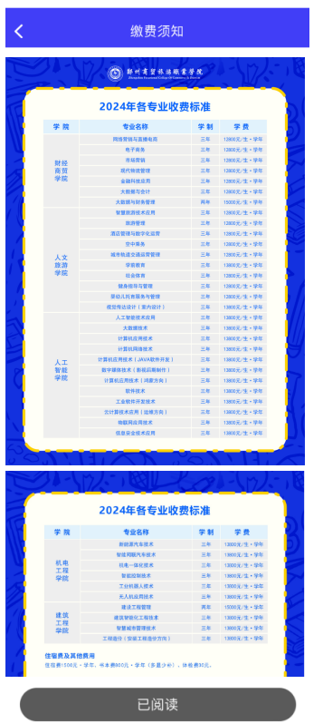 4.缴费须知:学生仔细阅读缴费须知的信息,阅读完毕之后,点击“已阅读”按钮。