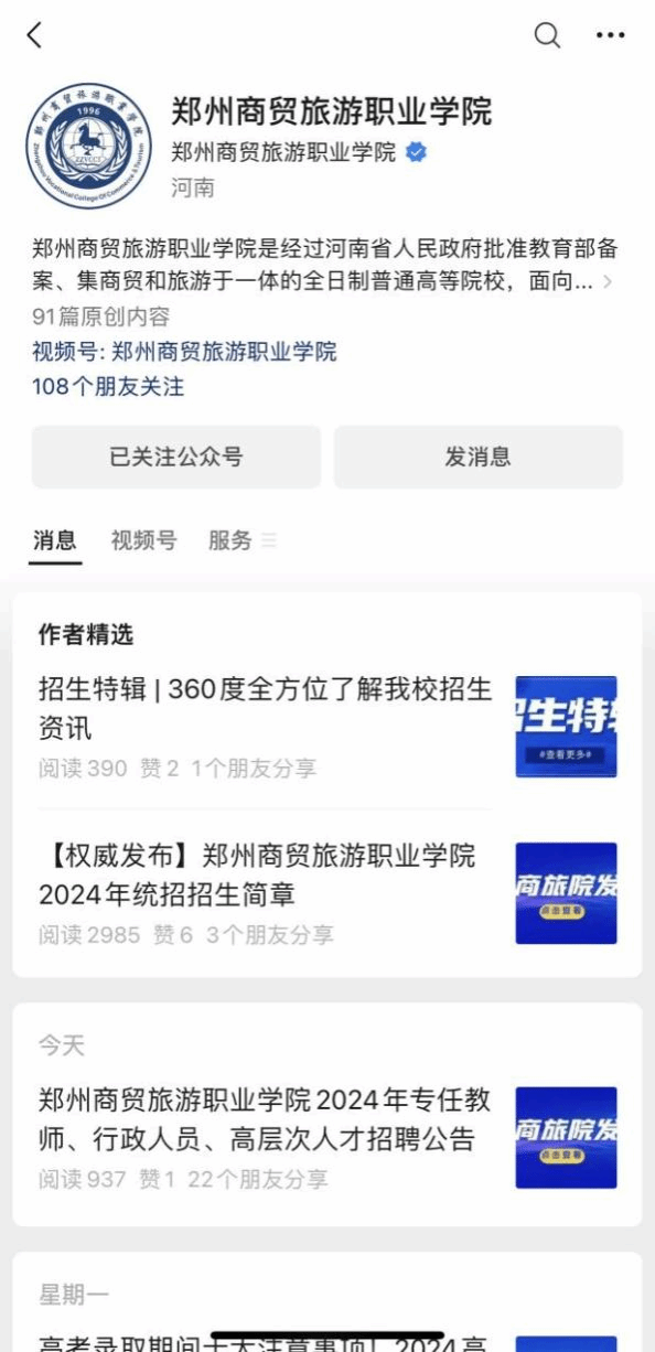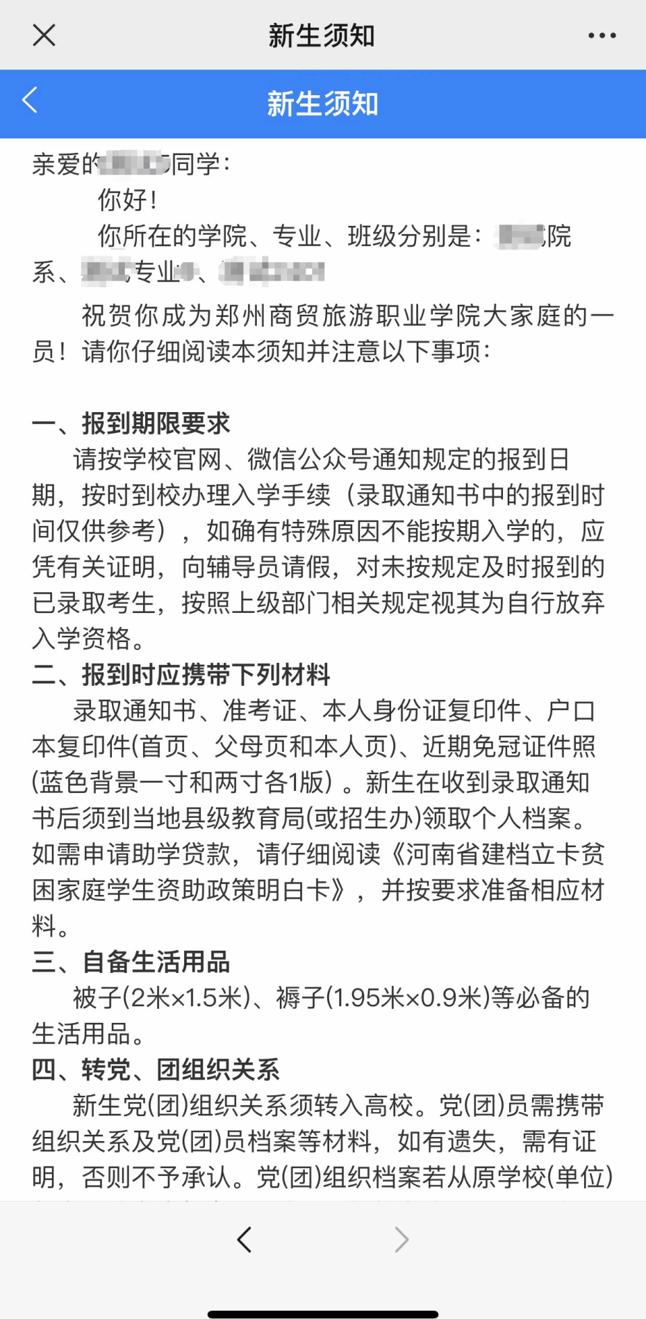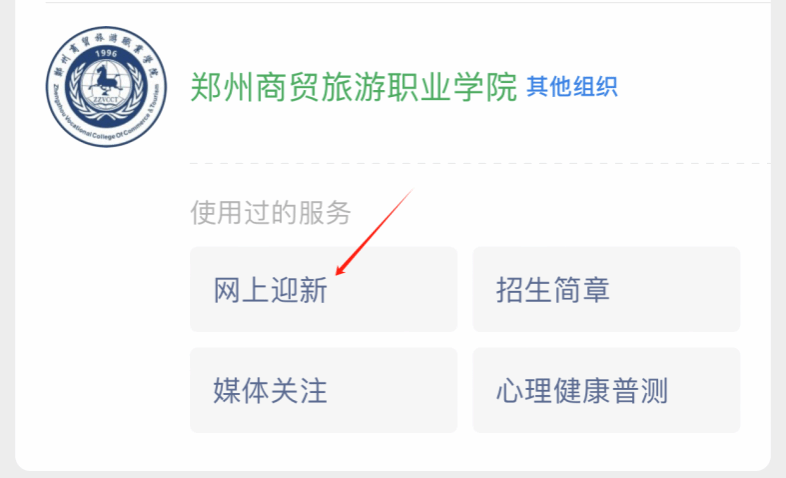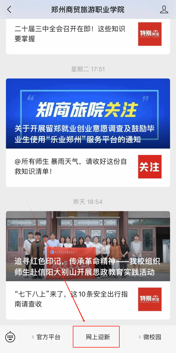一、关注学校微信公众号“郑州商贸旅游职业学院”。选择“网上迎新”。