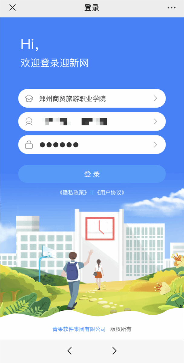 打开微信公众号下方网上迎新菜单,学校栏默认为“郑州商贸旅游职业学院”,学生输入自己的身份证号、密码(为身份证号后6位)。登录后点击“继续访问”。