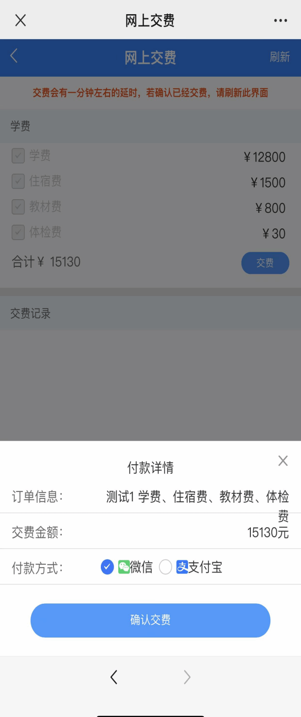 10.网上交费:点击交费,选择“微信”,跳转到云缴费小程序后,进行缴费操作。缴费完成后请等待一分钟左右,或点击刷新按钮查看缴费结果。缴费完成后订单信息会显示在缴费记录中。请同学们注意,需要提前将微信钱包绑定存有学费的银行卡,微信公众号只支持微信支付方式。