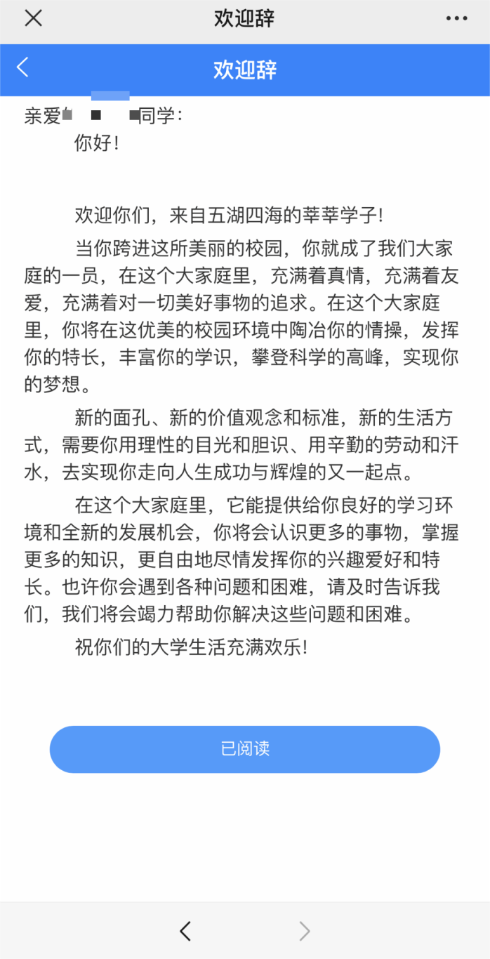 1.欢迎辞:学生进入到流程界面后,首先看到欢迎辞,仔细阅读后点击“已阅读”按钮,完成该环节。然后点击左上角白色箭头返回到掌上迎新,进行下一环节。