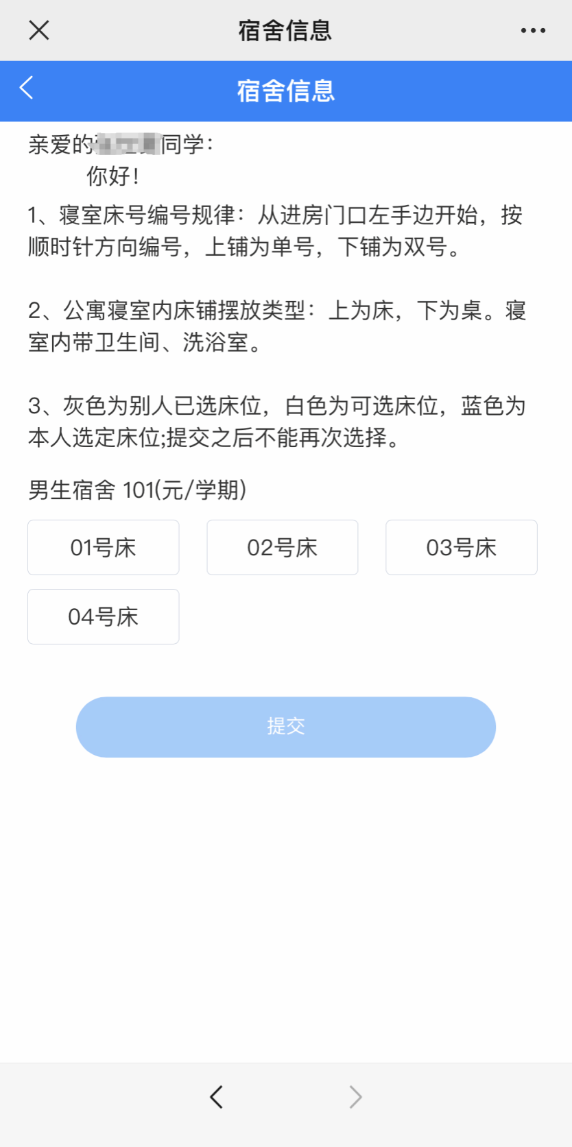 11.宿舍信息:学生网上交费完成后,点击宿舍信息,阅读床铺规则,选择床号,确认无误后点击“提交”。
