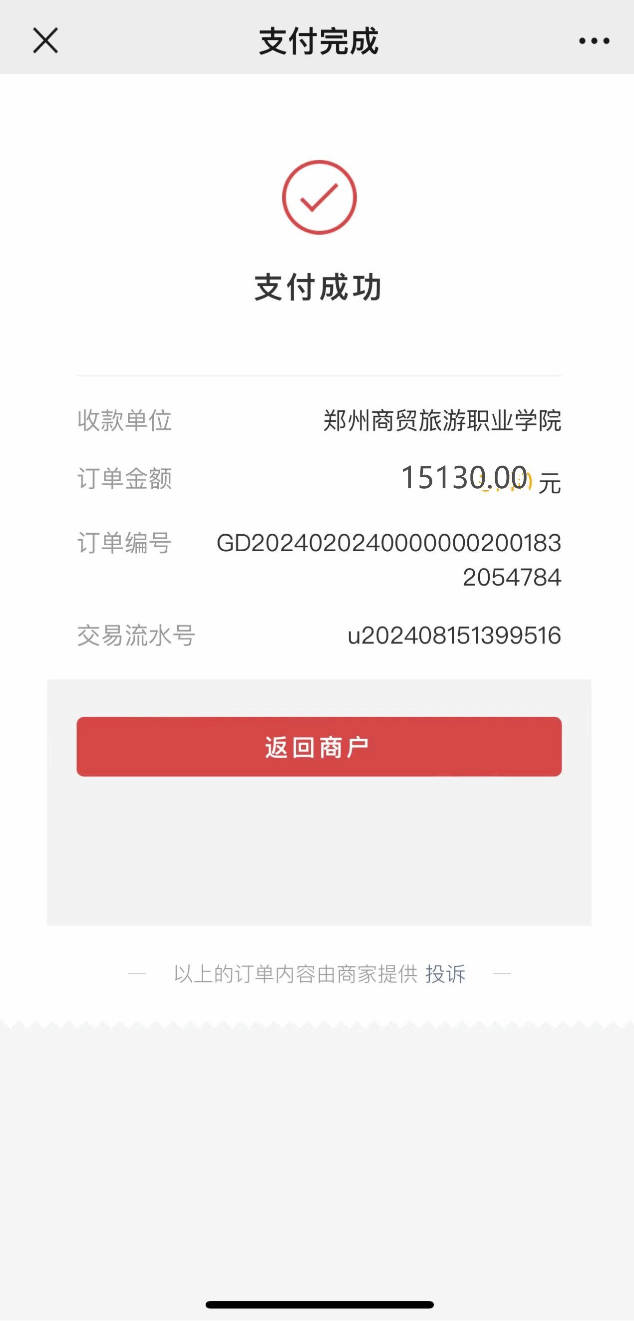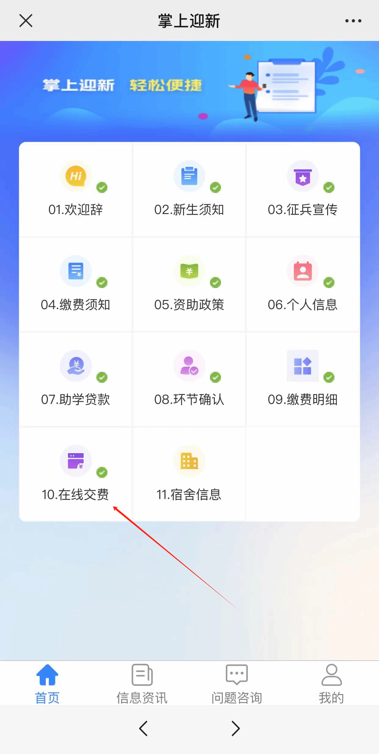 缴费完成后返回商户或重新进入掌上迎新,点击在线交费,即可查看交费结果: