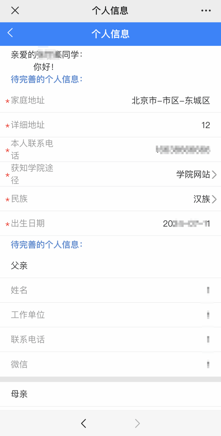 5.个人信息:学生需完善自己的个人信息,需要将带*号的填写完成,并且至少填写一位自己监护人的信息,确认无误之后,点击“提交”按钮。