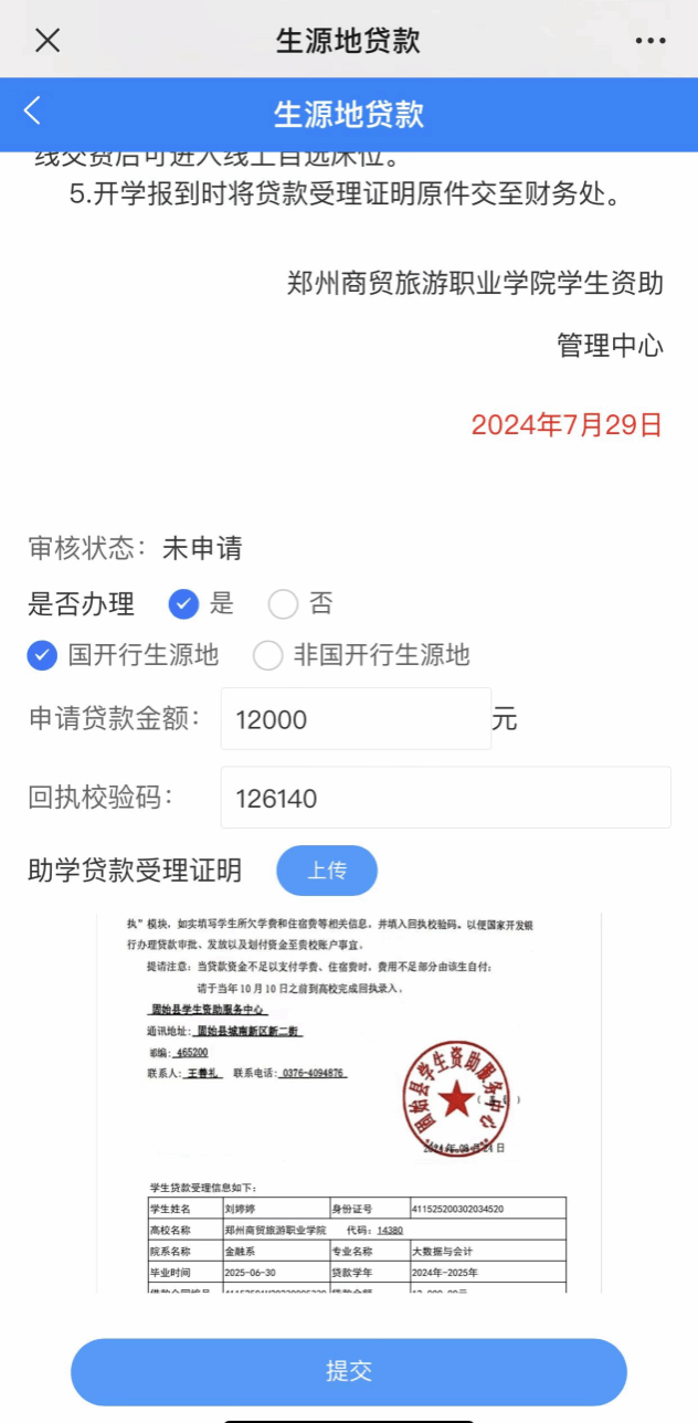 ①已办理生源地贷款的学生,选择“办理生源地助学贷款”填写贷款金额和受理有效验证码(六位),并上传“国家开发银行生源地信用助学贷款受理证明”照片,完成后点击“提交”按钮,提交后等待学校审核,审核通过后才能进行环节确认及网上交费。