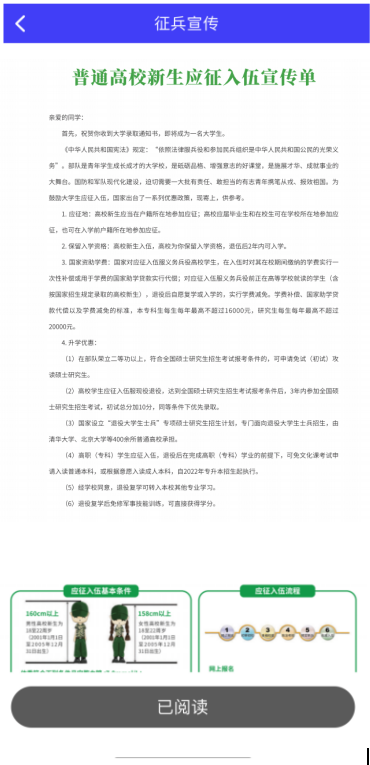 3.征兵宣传:学生仔细阅读征兵宣传的信息,阅读完毕之后,点击“已阅读”按钮。