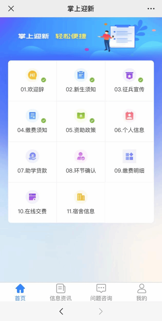 注意,每完成一个环节后点击屏幕上方箭头返回到掌上迎新页面,然后再进行下一环节。