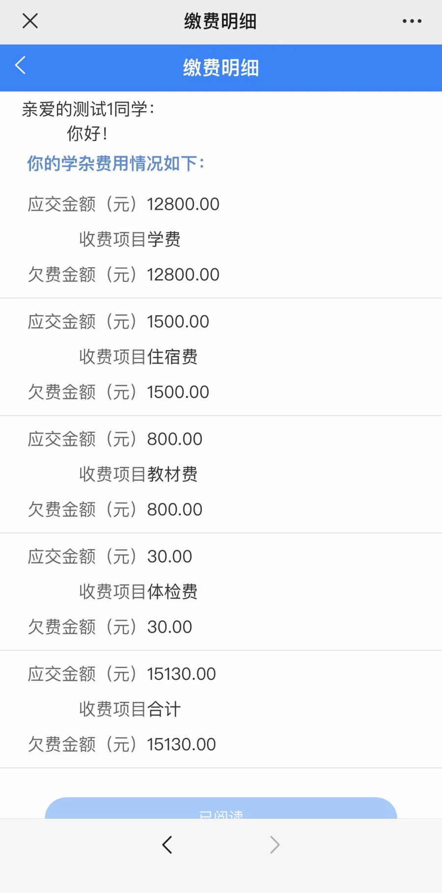 9.缴费明细:学生仔细阅读缴费明细的信息,阅读完毕之后,点击最后一行“已阅读”选项,进行下一环节“网上交费”。