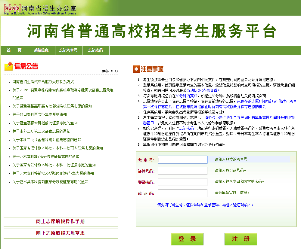 2、进入考生服务平台后,请仔细阅读“信息公告”区、“注意事项”区发布的政策公告和注意事项。