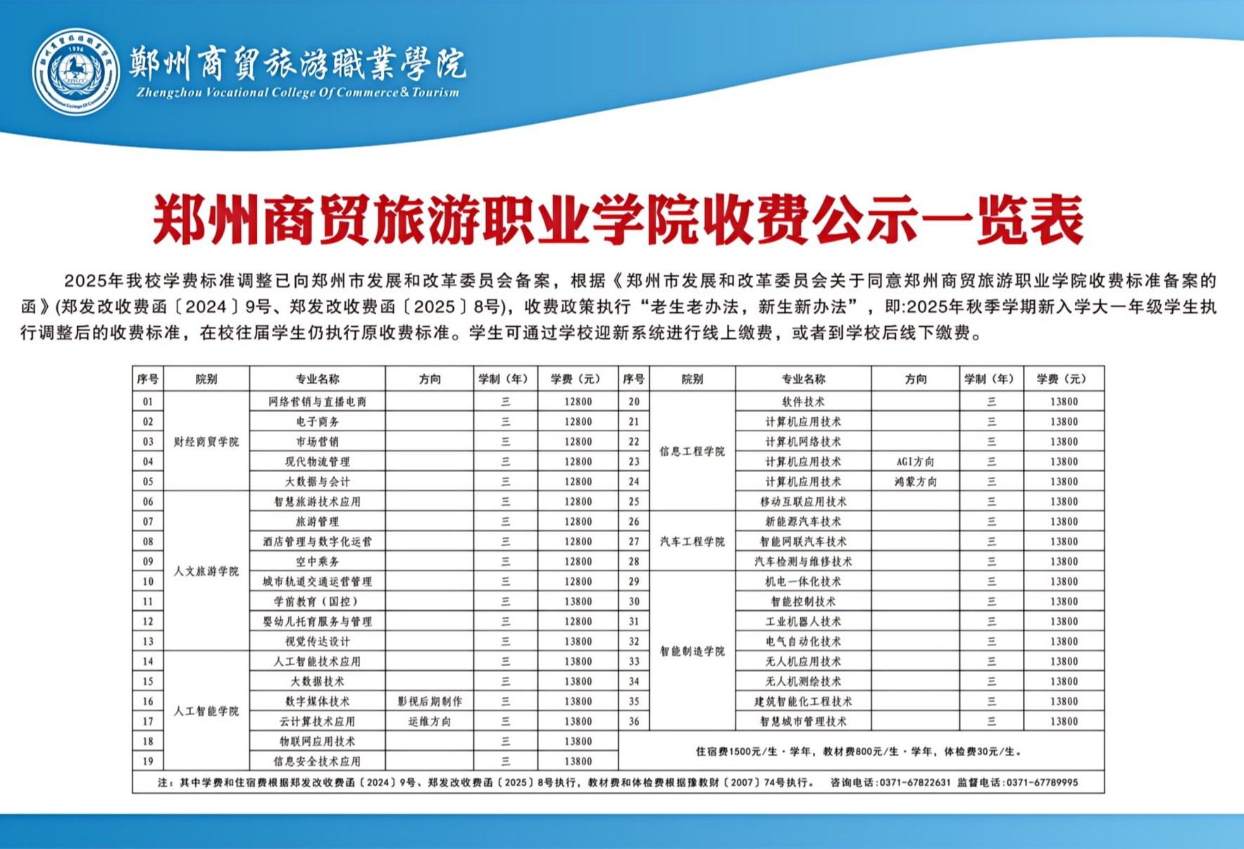 郑州商贸旅游职业学院2025年学生收费公示一览表