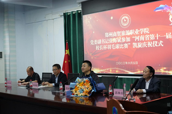 庆祝仪式在一阵阵热烈的掌声中结束,张海斌副书记努力拼搏、奋勇争先的精神激励着无数郑商旅院师生学子,希望全体师生以此为契机,踔厉奋发,勇毅前行,发挥榜样力量,秉持“厚德博学 日新月异”的校训精神,为学校争得更高的荣誉!(通讯员:季月月)