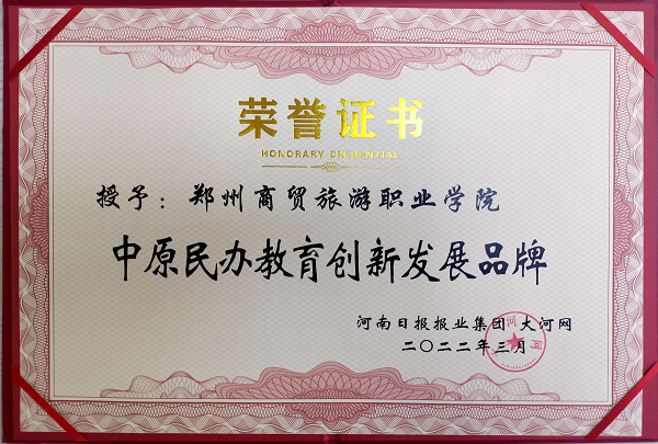 3月16日,河南日报报业集团大河网公布了河南省首届民办高校创新发展品牌建设风采展获奖名单,郑州商贸旅游职业学院荣获“中原民办教育创新发展品牌”称号!