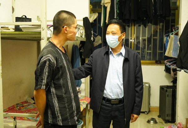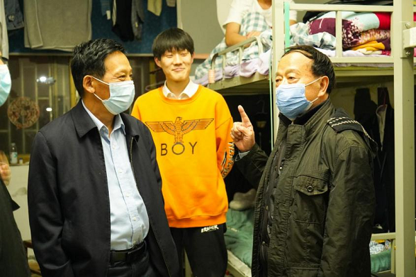 为进一步贯彻落实中央、省委、省委教育工委关于疫情防控工作会议精神,从严从筑牢学校安全防线,5月9日,执行校长郭文武,党委副书记郭林山,顾问教授于怀钦,纪委副书记李国超深入分包宿舍楼,全面了解学生学习、生活和身心状况,实地检查落实疫情防控工作。