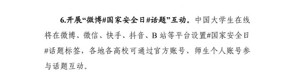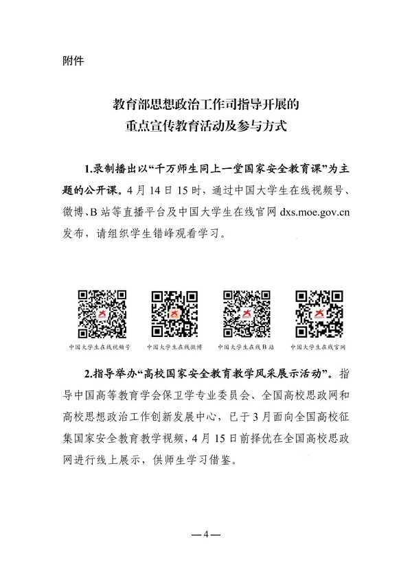 1.迅速安排部署。4月15日上午9:00—11:30,省委教育工委、省教育厅将开展国家安全教育日启动仪式暨大中小学思政课集体备课展示活动,采取线下+线上同步直播的形式,届时师生可通过扫描二维码观看直播(见附件2)。各地各校要高度重视,增强责任意识,在落实落细疫情防控措施的前提下,精心组织实施,充分调动学生的积极性、主动性和创造性,扩大教育覆盖面和受益面,切实增强广大学生的国家安全意识和能力。