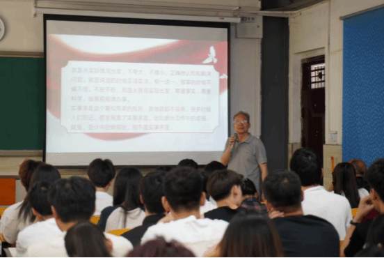 副校长冯鑫永教授以《贯彻党的二十大精神,准确把握实事求是》为主题,从实事求是的内涵、实事求是的要求、实事求是的重要性、新时代如何坚持实事求是等方面进行讲解。副校长冯鑫永教授讲课中,生动运用了“孔子东游”、“指鹿为马”、“皇帝的新衣”等故事揭示实事求是的本质,并结合党的遵义会议、十一届三中全会深刻解答实事求是的重要性,重点解析《反对本本主义》、《高举毛泽东旗帜、坚持实事求是的原则》、《正确认识改革开放前和改革开放后两个历史时期》中关于实事求是的重要论述,告诫同学们应实事求是的学习党的历史,坚持“打铁还需自身硬”的精神,踏踏实实学习。