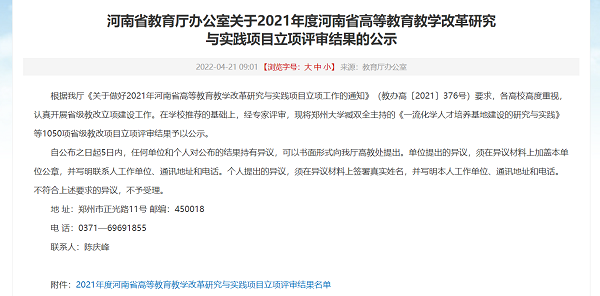 近日,从河南省教育厅官方网站获悉,在学校推荐的基础上,经专家评审,2021年度河南省高等教育教学改革研究与实践项目立项评审结果公示。我校2个项目获得立项: