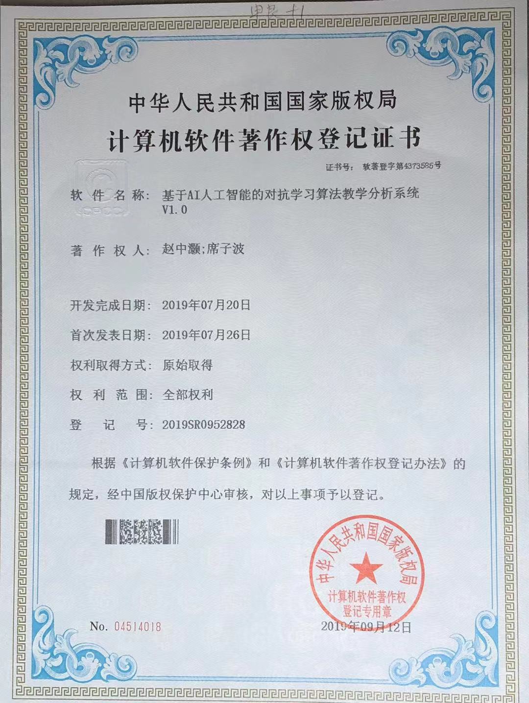 近日,郑州商贸旅游职业学院席副院长与18届优秀学生党员赵忠灏共同研发的《基于AI人工智能的对抗学习算法教学分析系统》成功获得了中华人民共和国国家版权局计算机软件著作权登记证书。这成为了学院获批国家级人工智能学院后第一例人工智能领域专利。