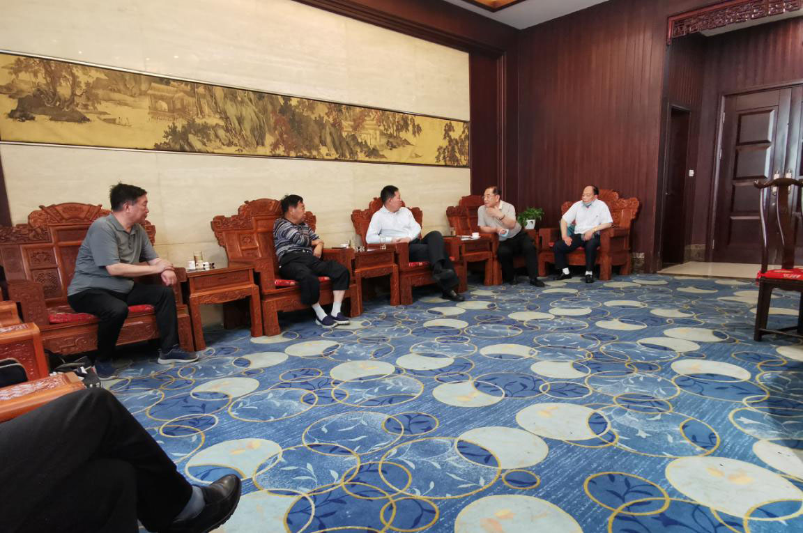 2020年5月20日,郑州市人大副主任、新密市委书记蒿铁群(右三)热情接待了学院班子。蒿书记指出:对学院新址落地新密表示非常欢迎,选址优美、职业教育发展前景广阔,新密市将大力支持。顾问李世斌(左一)、省教育厅巡视员朱玉山(左二)参加了会见和座谈。