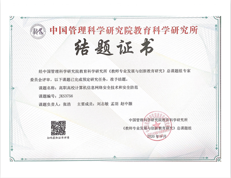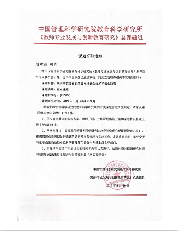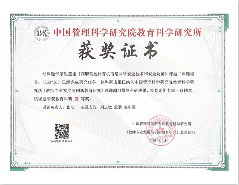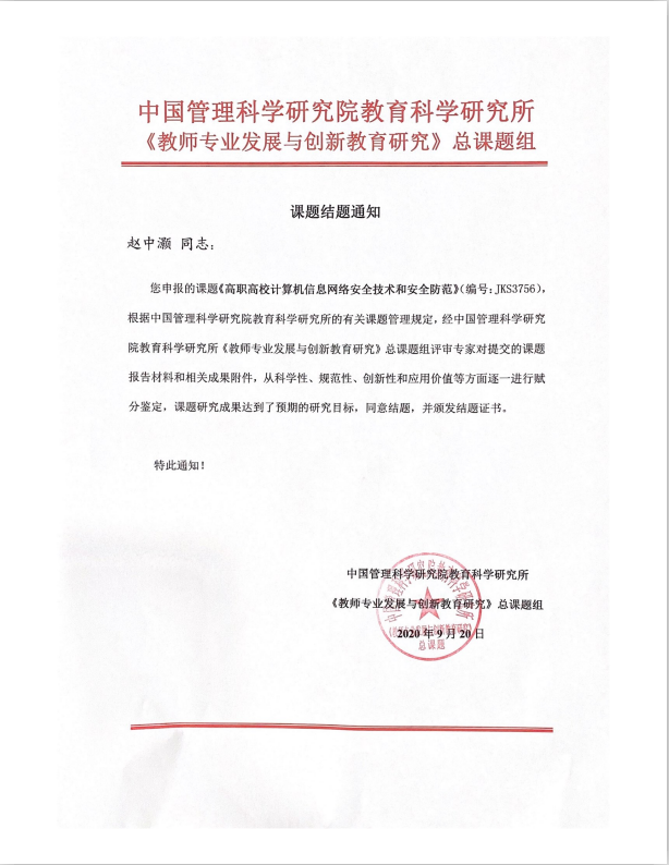 我院赵中灏同志在深度研究该问题后,经中国管理科学研究院 审核通过,申报《高职高校计算机信息网络安全技术和安全防范》课题。2020年9月,经课题专家组鉴定。将该科研成果纳入中国管理科学研究院教育科学研究所《教师专业发展与创新教育研究》总课题组最终研究成果,隶属国家级课题、国家十三五重点规划课题,经鉴定组专家一致同意该课题荣获教育科研一等奖!希望我院师生以此为荣,以赵中灏同志为榜样,囊萤映雪为学院贡献力量!