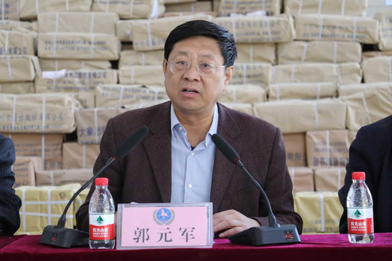 在图书捐赠仪式上中原出版传媒集团董事长郭元军首先发表了激情洋溢的讲话,他指出,作为我省最大的文化产业集团、教育出版集团和唯一的国有上市文化企业,中原出版传媒集团始终坚持“为人民做出版、给时代留回声”,用心书写“书比天大,责比山重”的文化理想与情怀,用情诠释“一书济天下、一书传千年”的出版使命与担当,打造“出版豫军”品牌。出版集团已成为推动全民阅读、建设“书香中原”的一支文化劲旅。他希望满园闻书声,满园飘墨香,浓郁的书香会飘到学院的各个角落!