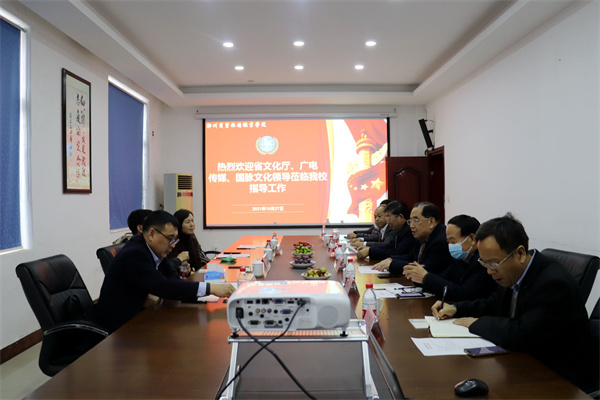 10月27日下午,原河南省文化厅副厅长副厅长、党委委员、一级巡视员郭书城,河南广电传媒控股集团党委委员、监事会主席杨曦,河南广电传媒控股集团监事会专职监事孙茹,河南省国脉文化产业园有限公司董事长、河南省国脉文化遗产传承保护中心主任李翔一行4人莅临我校指导工作。董事长席青慧,党委书记李普涛,党委副书记郭林山、郭宝宪,副院长王素湘,教务处处长闫喜亮,校企合作办主任李万银,学生处副处长姜昭明及相关处室负责人陪同。