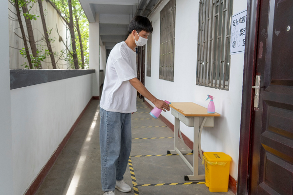 在开考前,后勤处工作人员多次进行考场复勘,在考场内外进行卫生死角彻底打扫,公众区域全面消毒进行多项考前准备工作。