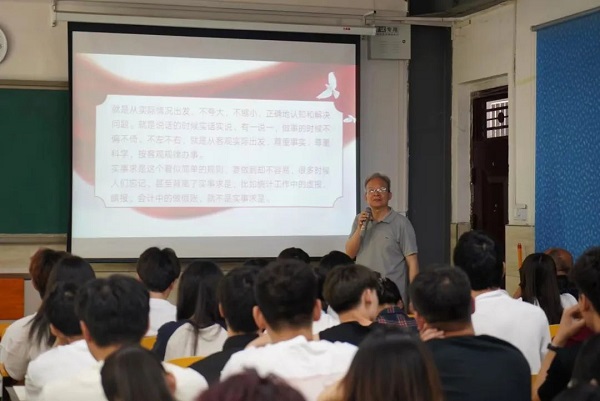副校长冯鑫永教授以《贯彻党的二十大精神,准确把握实事求是》为主题,从实事求是的内涵、实事求是的要求、实事求是的重要性、新时代如何坚持实事求是等方面进行讲解。副校长冯鑫永教授讲课中,生动运用了“孔子东游”、“指鹿为马”、“皇帝的新衣”等故事揭示实事求是的本质,并结合党的遵义会议、十一届三中全会深刻解答实事求是的重要性,重点解析《反对本本主义》、《高举毛泽东思想旗帜,坚持实事求是的原则》、《正确认识改革开放前和改革开放后两个历史时期》中关于实事求是的重要论述,告诫同学们应实事求是的学习党的历史,坚持“打铁还需自身硬”的精神,踏踏实实学习。