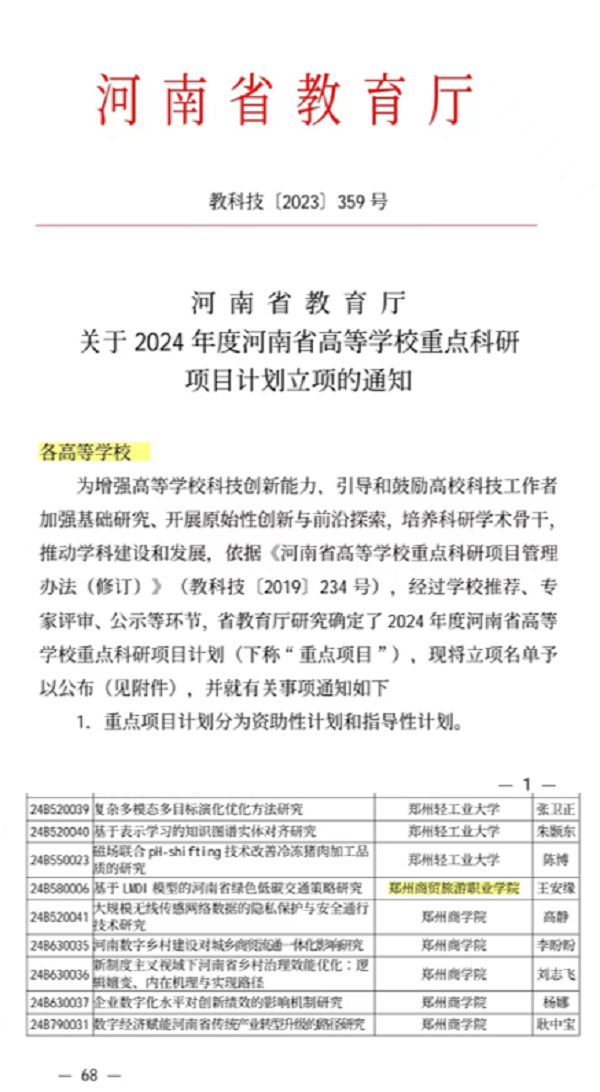 近日,河南省教育厅下发了《 关于2024 年度河南省高等学校重点科研项目计划立项的通知》(教科技〔2023〕359 号),在河南省教育厅组织的2024 年度河南省高等学校重点科研项目计划立项的工作中,我校科研项目《基于LMDI模型的河南省绿色低碳交通策略研究》获得立项批准。