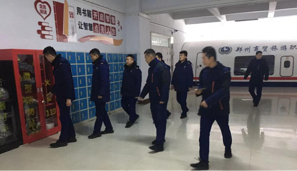 1月18日上午,郑州市中原区富民路消防站到我校检查指导工作,消防站郭队长带领消防战士对学校的重点部位进行了抽检。