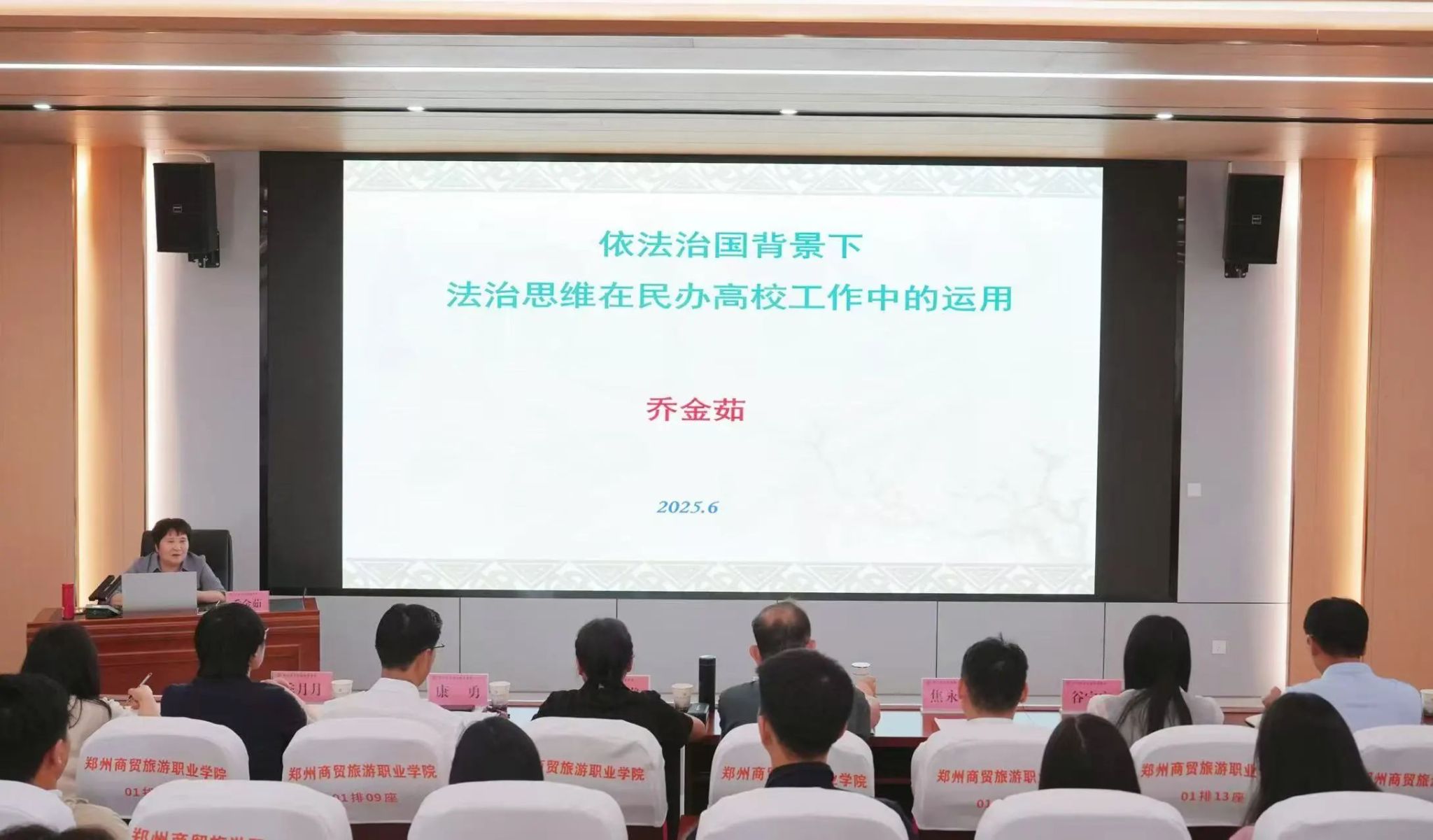 讲座中,乔金茹教授围绕“依法治国的背景”、“依法治校和法治思维背景”、“法治思维的特质”和“民办高校工作运用法治思维的现实路径”等四个方面展开,并结合近年来民办高校发展中的典型案例,深入分析了高校常见法律问题的成因、危害及应对策略。乔金茹教授语言生动,案例鲜活,将深奥的法律知识转化为贴近校园管理的治理效能。她指出,高校在快速发展的同时,更应强化法治保障,通过制度建设与文化培育,形成以法治为核心的治理生态。